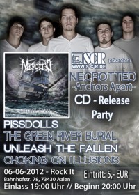 Am 06. Juni 2012 ist es endlich soweit! Das langersehnte Debüt-Album 'Anchors Apart' der Abtsgmünder Deathcore-Truppe NECROTTED erscheint über das Ludwigsburger Label SUPREME CHAOS RECORDS auf dem Markt und wird die Musikindustrie in ihren Grundfesten erschüttern. Und dieses Ereignis muss natürlich gefeiert werden! Deshalb laden die fünf Jungs an oben genanntem Datum zu ihrer CD-Release Party im Rock It in Aalen ein.