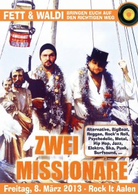 FETT und Waldi sind dieses Mal im Auftrag des Rock’n Roll - Herrn unterwegs, um ungläubige Partygänger mit ihrem einzigartigen Musik-Mix zu bekehren und sie auf den richtigen Weg zu bringen. Dazu bedienen sie sich derselben Mittel wie bei ihrer Partyreihe „Schdanga Beat“, die des Öfteren über das Aalener Land hinwegfegt.