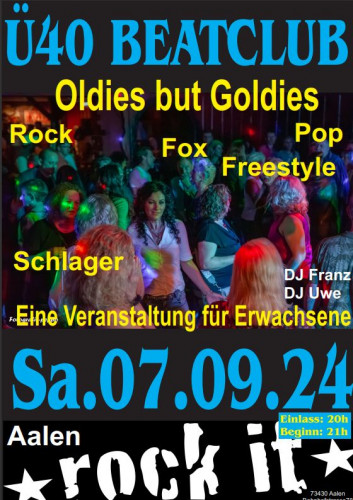 Am Samstag, den 07. September 2024, öffnet das legendäre Rockit in Aalen erneut seine Türen für alle Liebhaber guter Musik der Ü40-Generation. Unter dem charmanten Motto "Oldies but Goldies" verspricht der unvergleichliche DJ Franz eine Nacht voller rhythmischer Freude und unvergesslicher Beats.